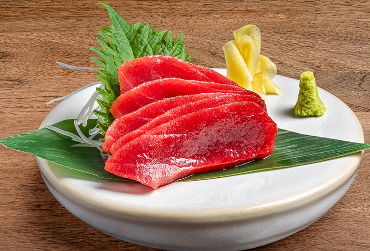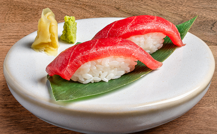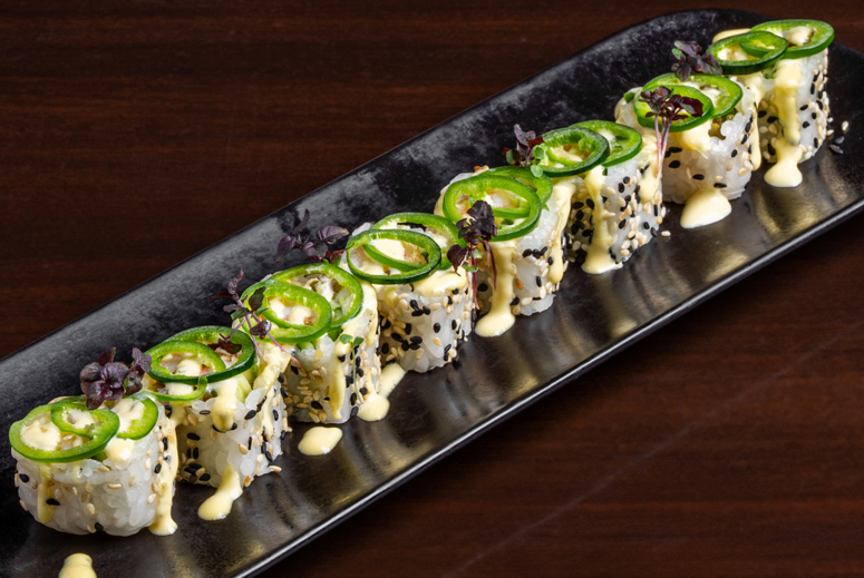 إيبي تمبورا وخيار في ورق الأرز مع السمسم، يعلوه هالبينو، شيسو، وصلصة يوزو مانجو أيولي.