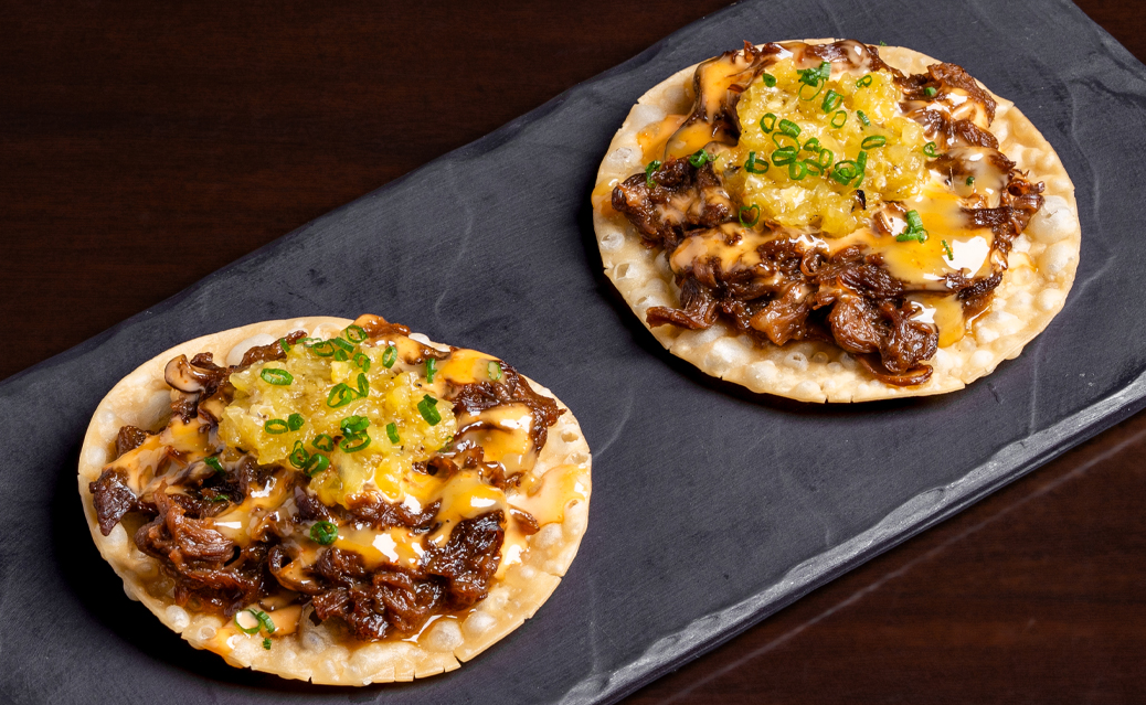 ضلوع قصيرة مع صلصة بونزو، مغطاة بتوستادا جيوزا مقرمشة، وصلصة سريراتشا، وصلصة الأناناس.